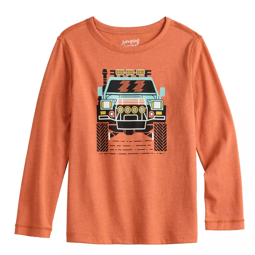 He’ll love his look in this boys’ monster truck long sleeve graphic tee from Jumping Beans.