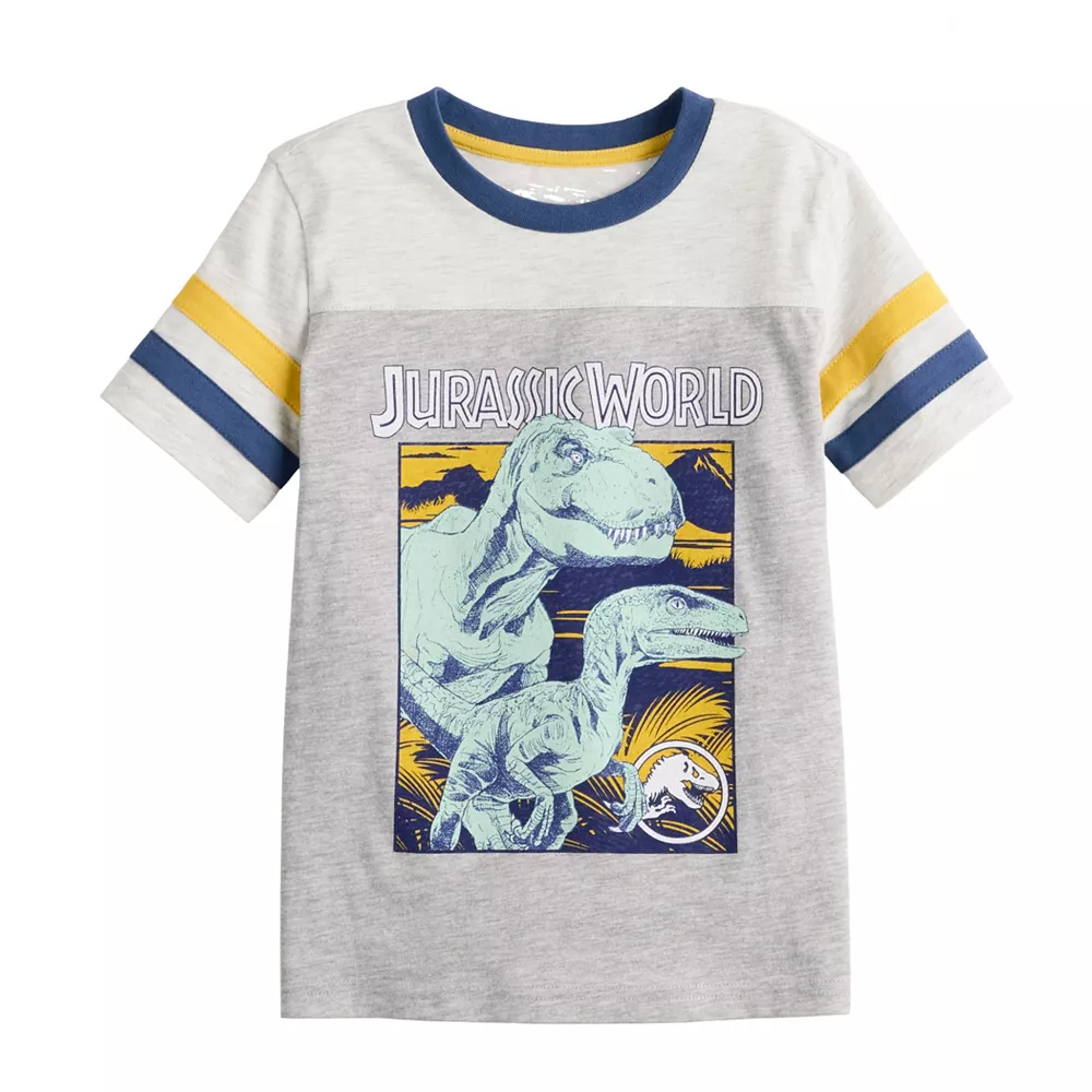 Give his wardrobe a refresh with this boys’ Jurassic World varsity sleeve graphic tee from Jumping Beans.