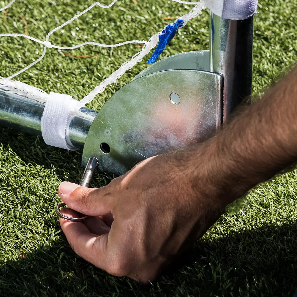 - Precision locking pins secure the poles together and galvanized ground stakes keep the goal attached firmly to the ground