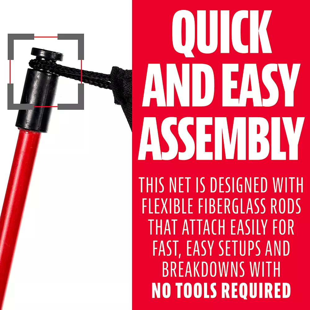 - QUICK AND EASY ASSEMBLY: This net is designed with flexible fiberglass rods that attach easily for fast, easy setups and breakdowns with no tools required