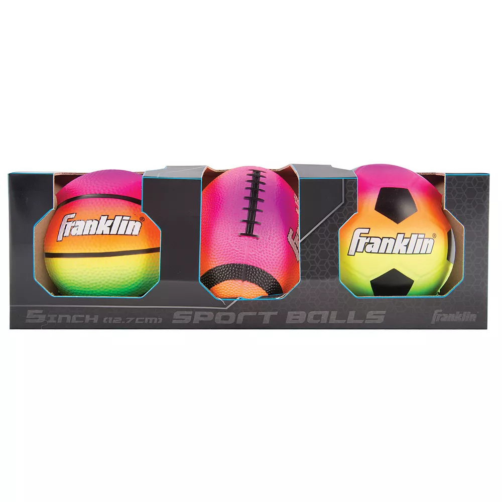 - Set includes: 5” soccer ball, 5” basketball, & 5.5″ football