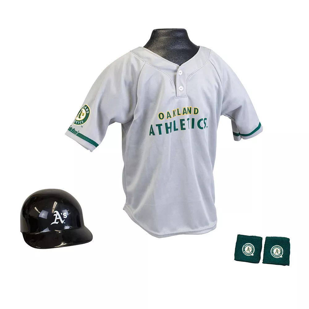 Complete with an Oakland Athletics jersey, plastic helmet and wristbands, this boys’ uniform set makes game day fun. In gray/green.