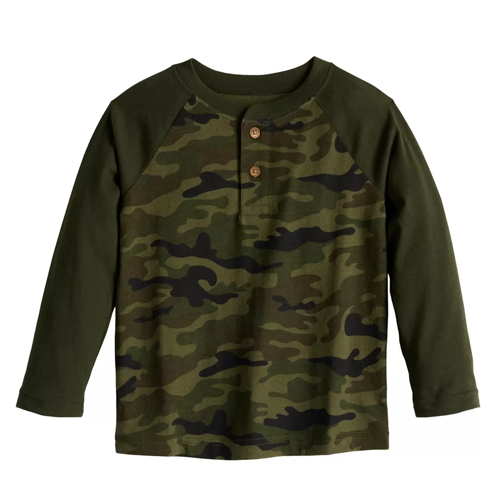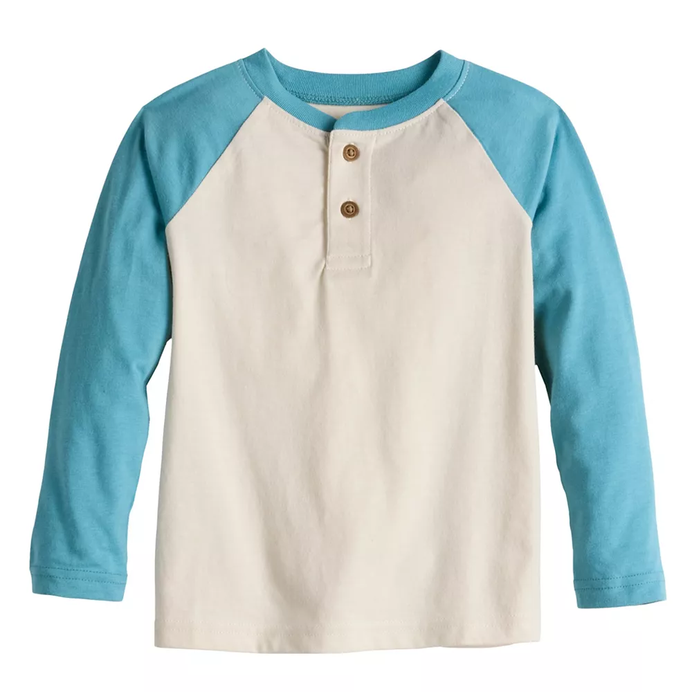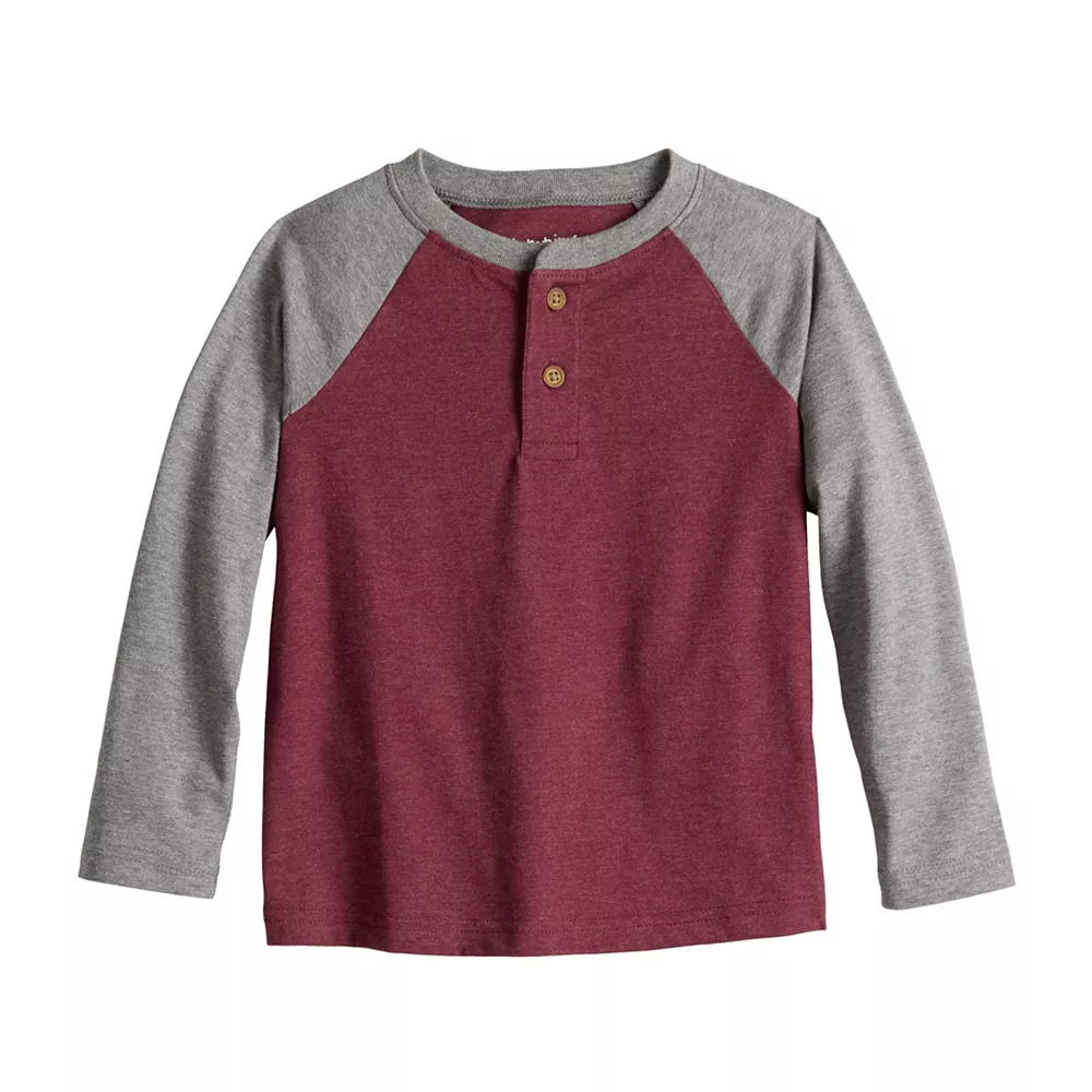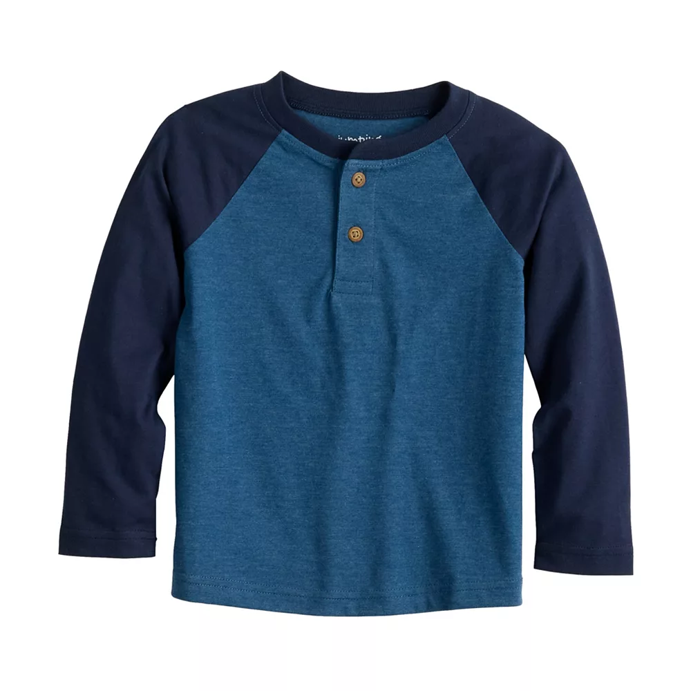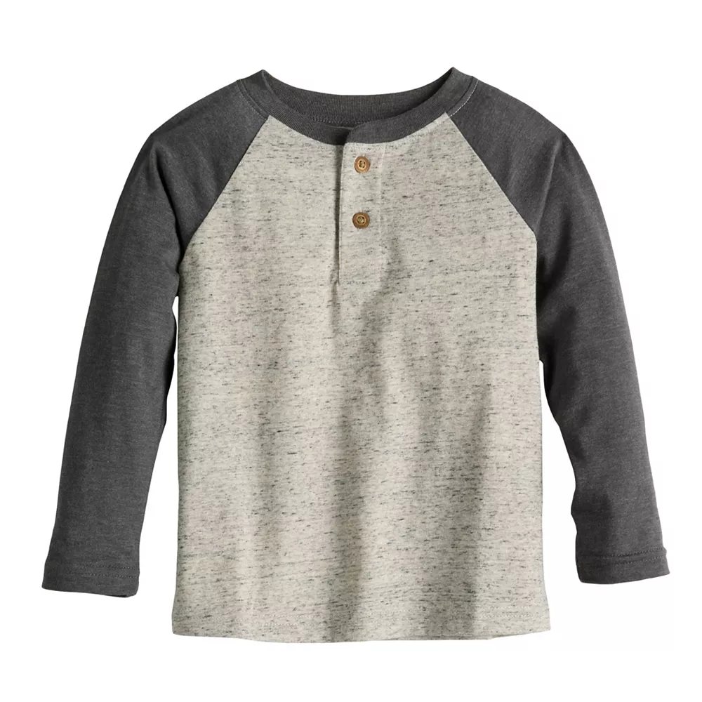 Keep his look classic in this toddler boys’ long sleeve raglan Henley tee from Jumping Beans.