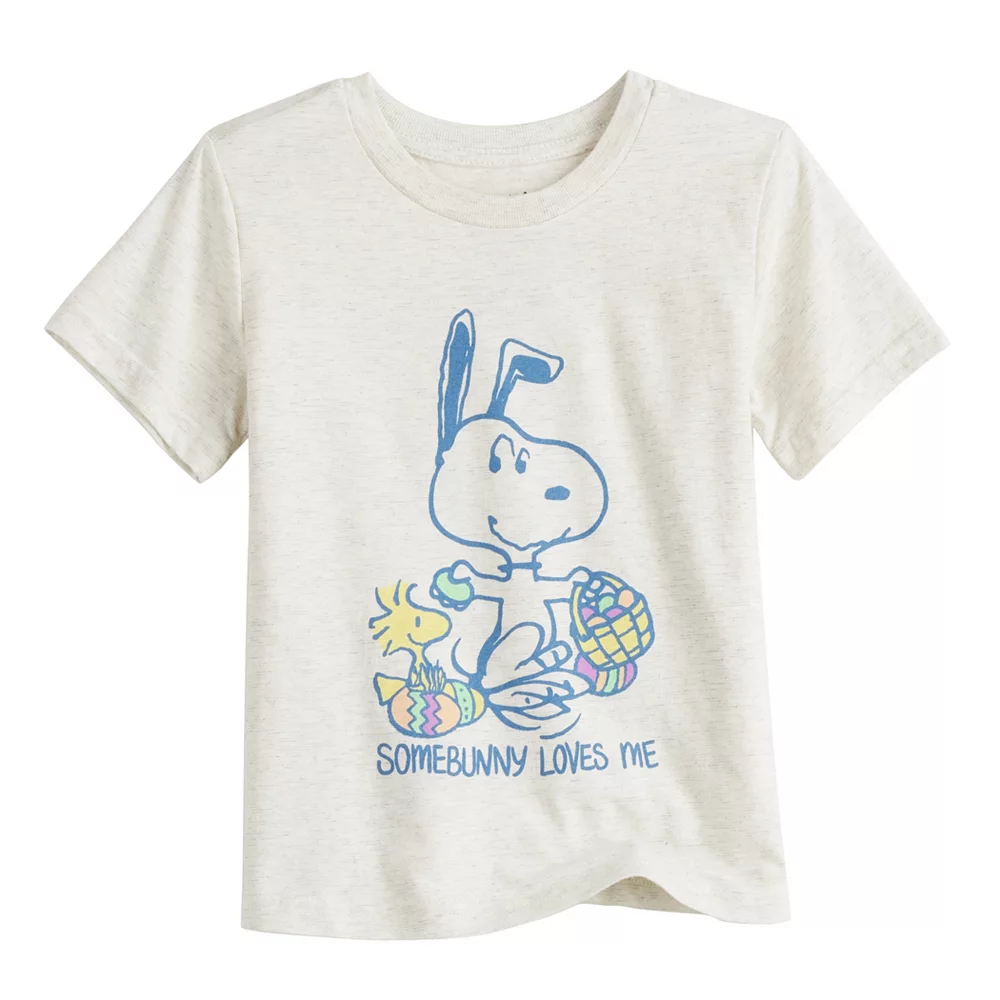 Featuring his favoite Peanuts pals, Snoopy and Woodstock, he’ll love this boys’ Somebunny Loves Me graphic tee for Easter.