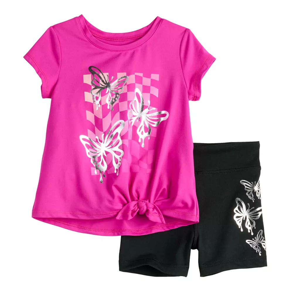 Perfect for days full of games and play, she’ll love the all-day comfort and cute style of this girls’ Jumping Beans tie-front top and bike shorts set.